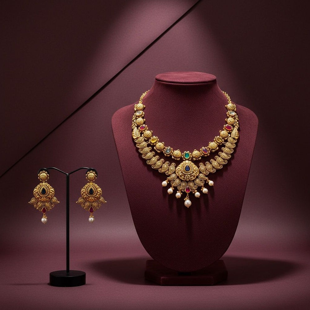 Riya Gemstone Necklace Set brings a touch of luxury to your everyday attire, infusing it with creative elegance. Crafted with gold and diamonds, it's an ideal accessory for any occasion.